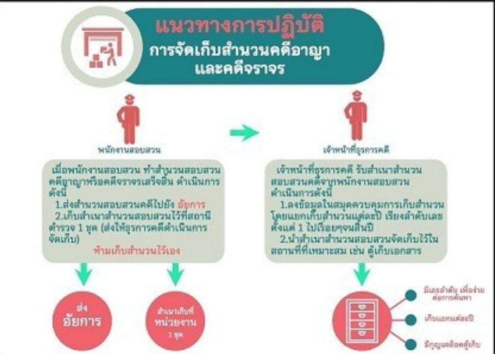 แนวทางการจัดเก็บสำนวนการสอบสวนคดีอาญาและคดีจราจรให้หัวหน้างานสอบสวนมีหน้าที่เก็บรักษาไว้ในห้องหรือตู้ที่จัดทำไว้โดยเฉพาะให้อยู่ในสภาพเรียบร้อย และระมัดระวังมิให้สูญหาย จัดการเก็บสำนวนการสอบสวนและสำเนาสำนวนการสอบสวน ให้แยกเป็นสัดส่วน ได้แก่
